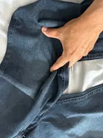 They’re not really jeans. They look exactly like jeans material but they’re about half as thick and slightly stretchy. Very comfortable and great quality. I ordered 10+ because i like them so much.